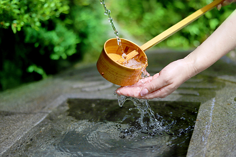 最初に、ひしゃくで御神水をくみ、左右の手を清めます。
